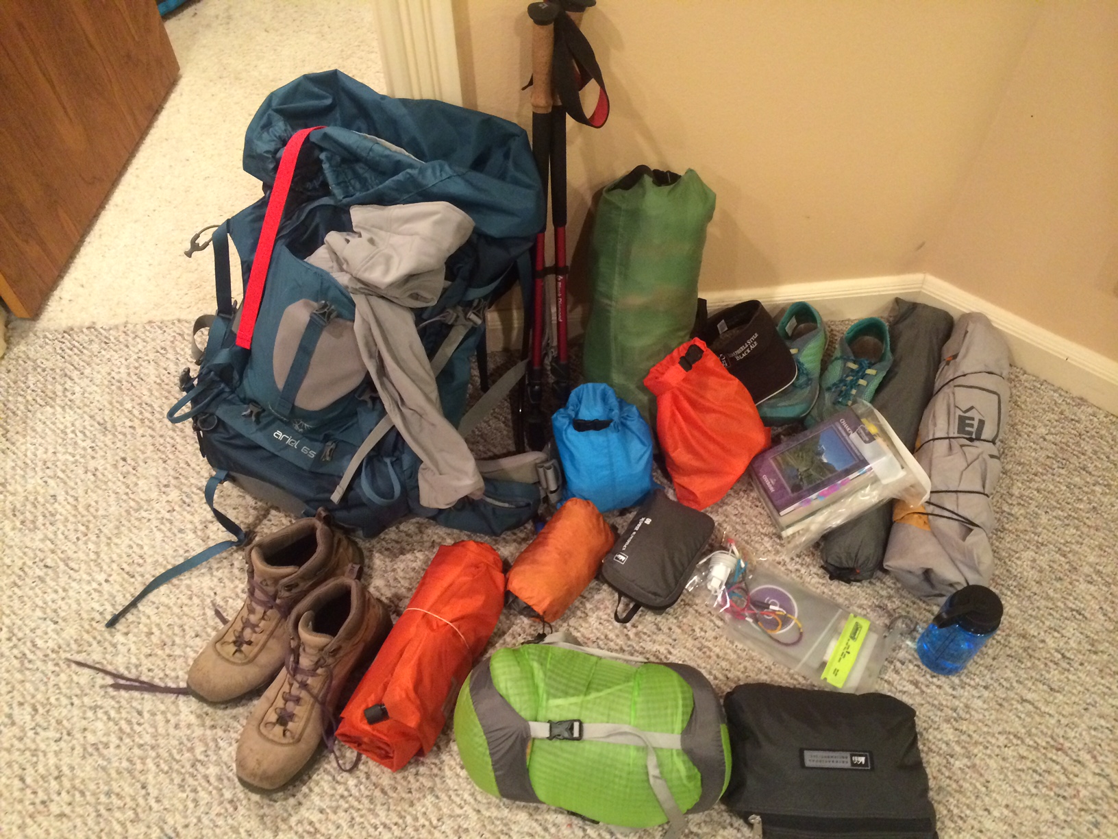 Everything I brought with me on the plane, was carried 90 miles on my back. I had a lot of fun working on my packing list over several months leading up to the trip. Obviously, packing for your own needs, expectations, location and season are the priority, but I think it’s always helpful to see what other’s brought, needed, wish they’d had, and wished they’d left! Here’s what I had with me: