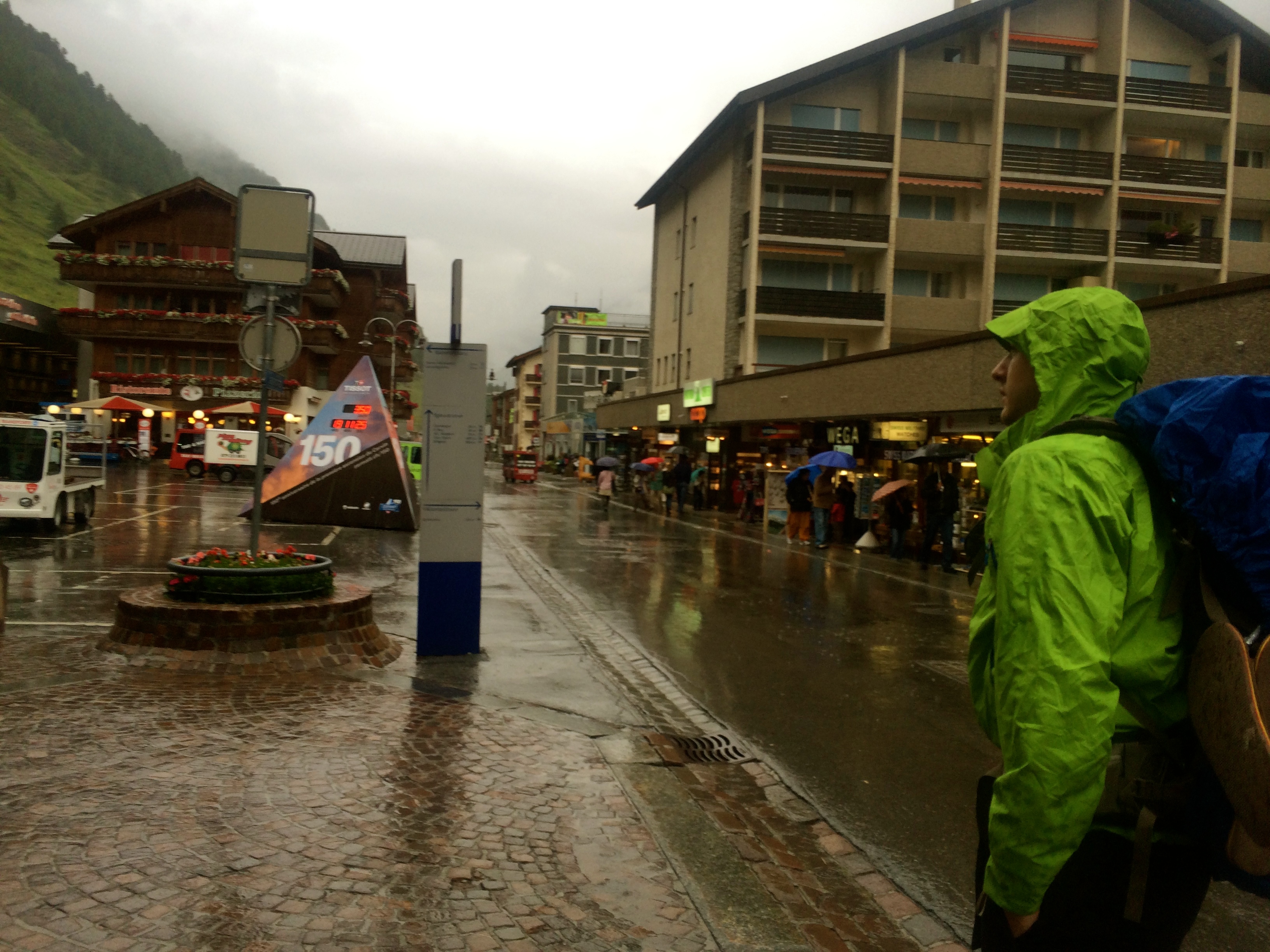 We awoke early, to a welcome quiet that said the rain had ceased for now, giving us enough motivation to pack up and get walking while the skies parted enough for our first glimpse of the Matterhorn. We partook in breakfast at one of the many swiss springs found in towns throughout the trip. The first one by a church that randomly serenaded us with 15 minutes of church bells.