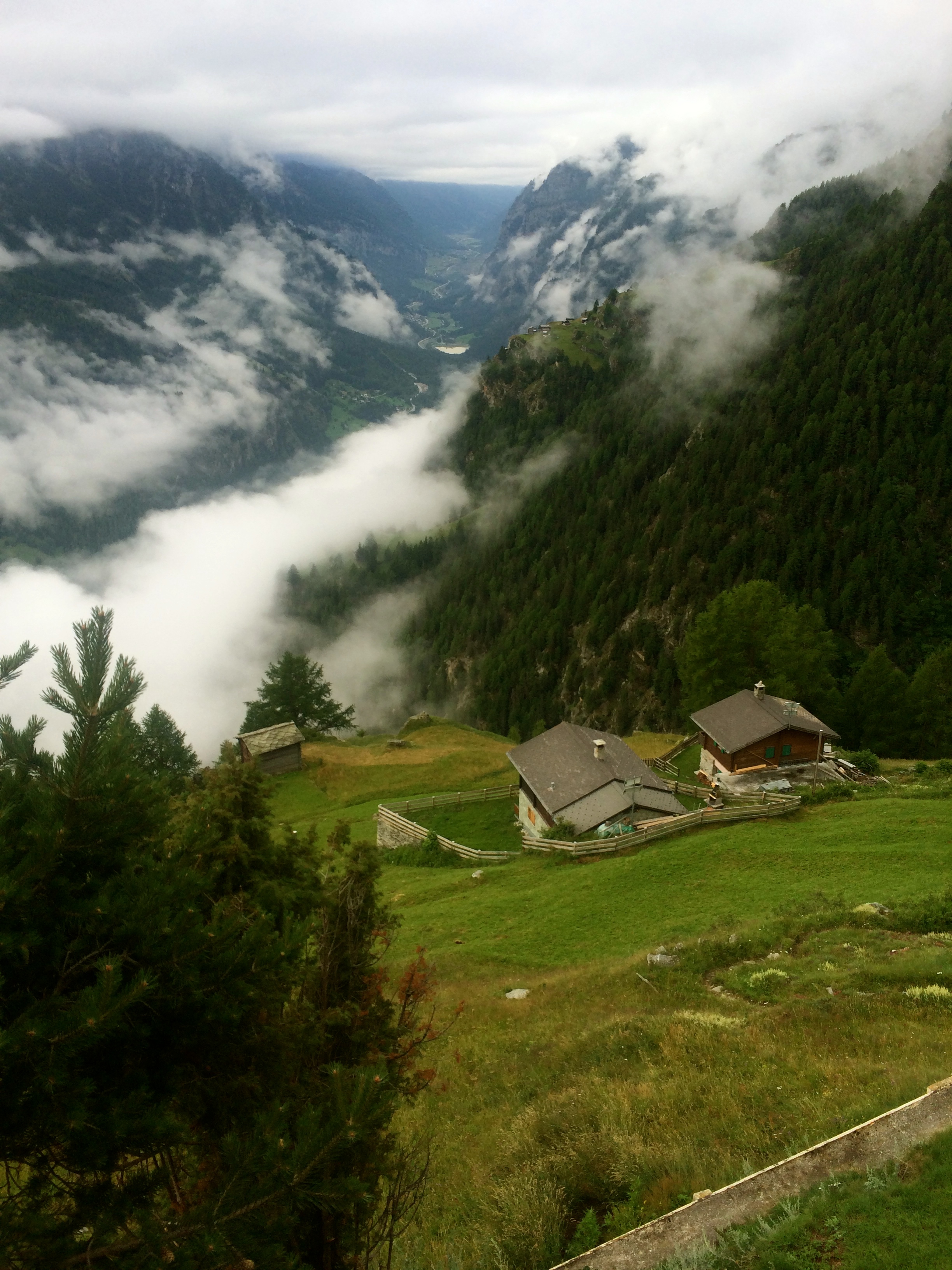 The walk meandered on side roads along the river and up through farms and pastures with the valley walls clouded above. We arrived in a sleepy downtown St. Niklaus around early afternoon and found a small grocery to restock once it reopened at 2pm.