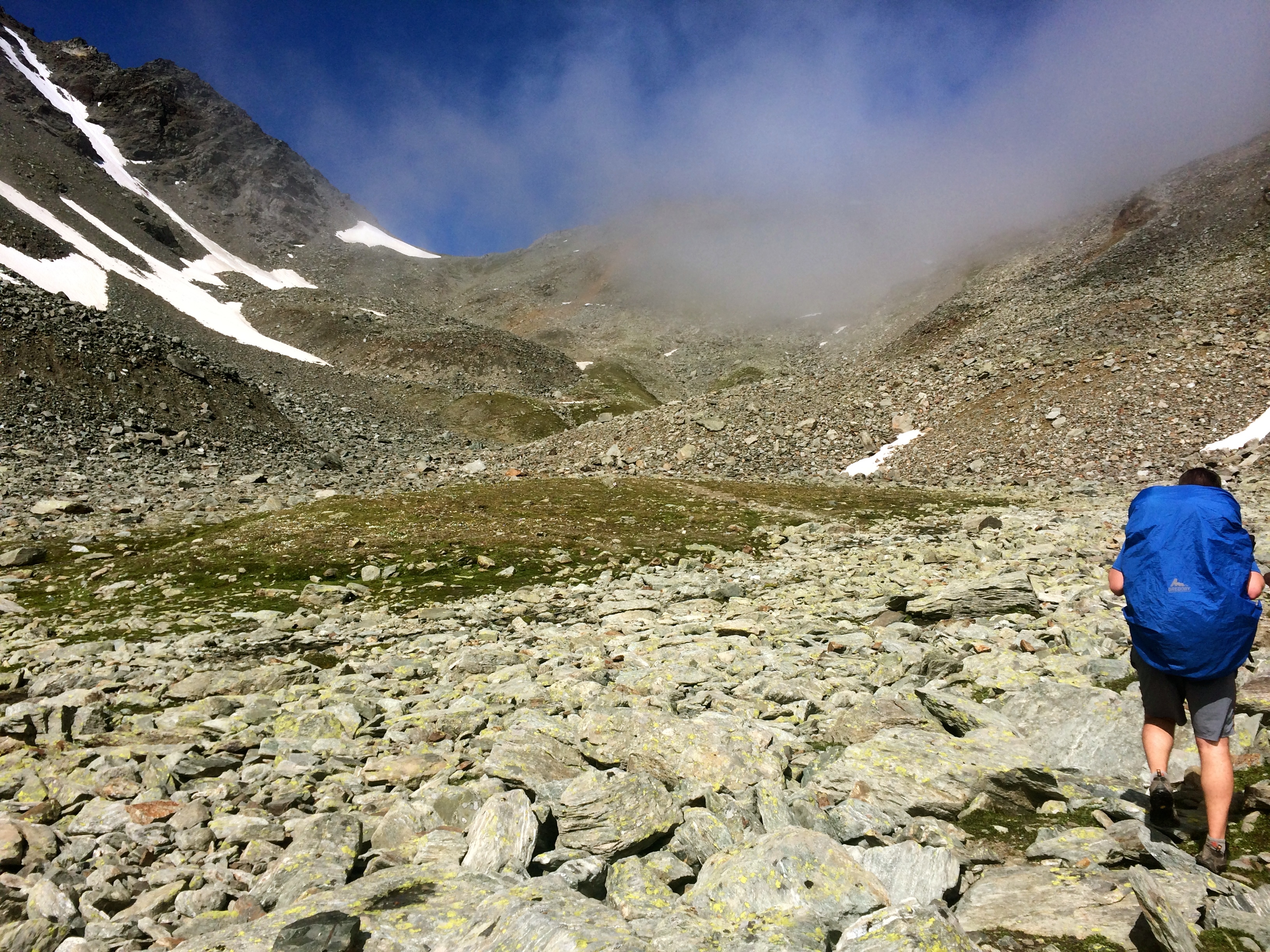 Hiking on into the high valley below our first pass, we hiked over talus and alpine cobble stone like trail, well marked with painted blazes. Late morning we broke out of the clouds to a beautiful blue sky and a straight shot up the valley to Augstbordpass. We carved our way up the gravel trail as other hikers made their way down, most sporting similar packs, trekking poles, and smiles.
