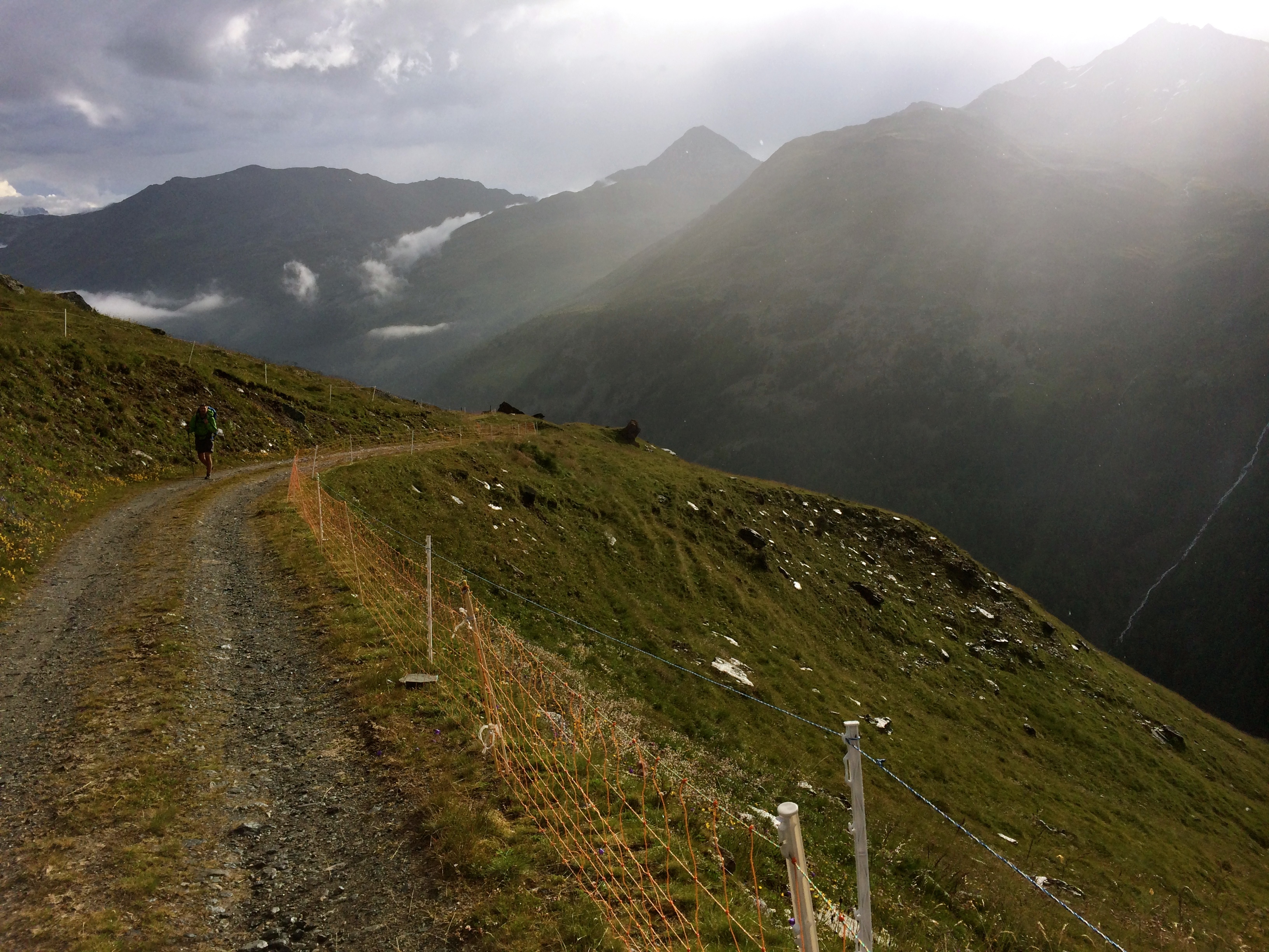 After leave the Taschalp valley, we crossed what came to be the sketchiest section of the whole trip. The valley wall was constantly crumbling, especially in the wet weather, so we walked under and through manmade protection on the trail.