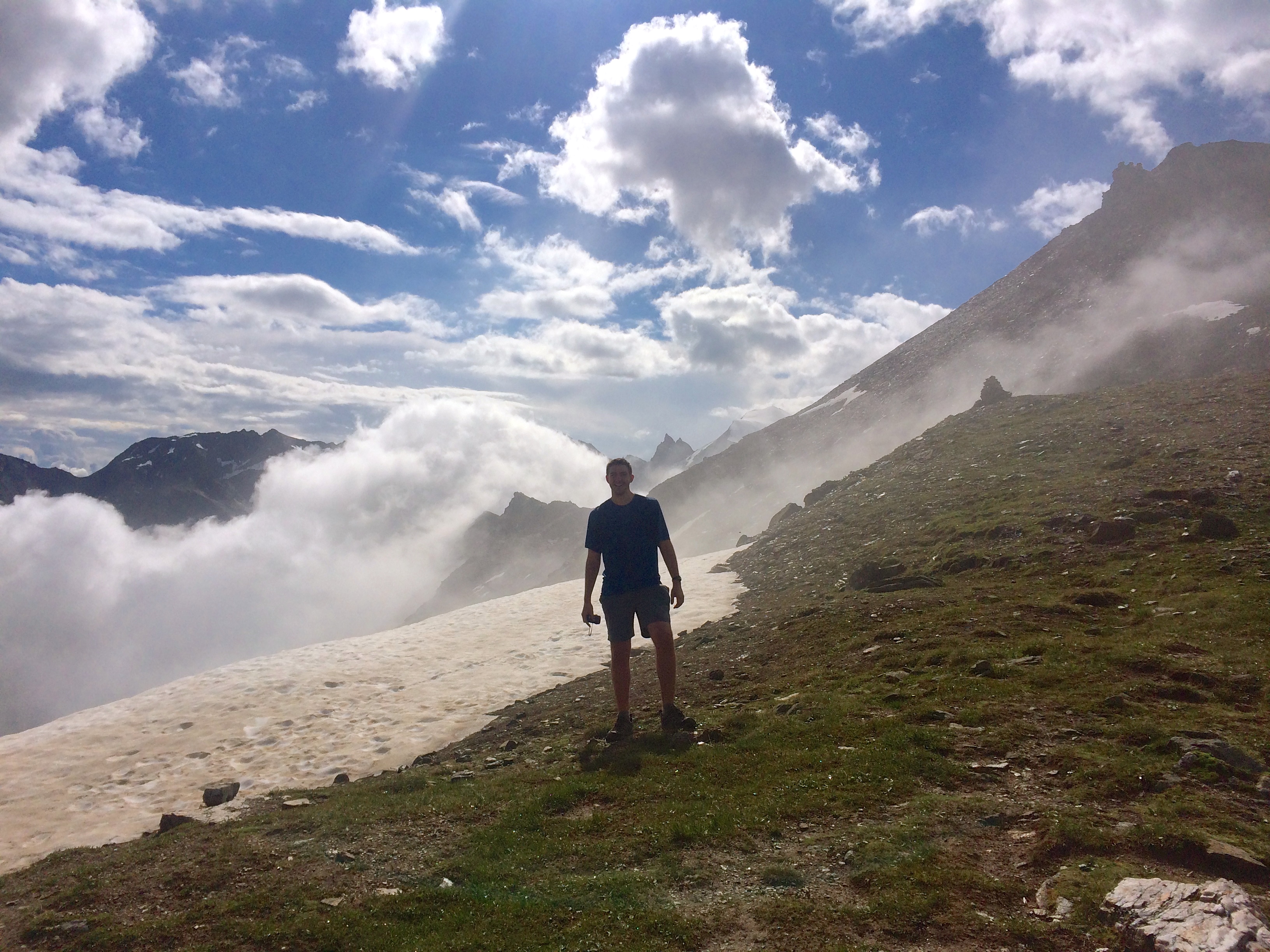 About an hour out of Chalte Berg we summited the pass and enjoyed the sun, clouds, and view all to ourselves. A good start to the day. Mid morning we started our decent into the Zinal valley, following signs for the long traverse north.