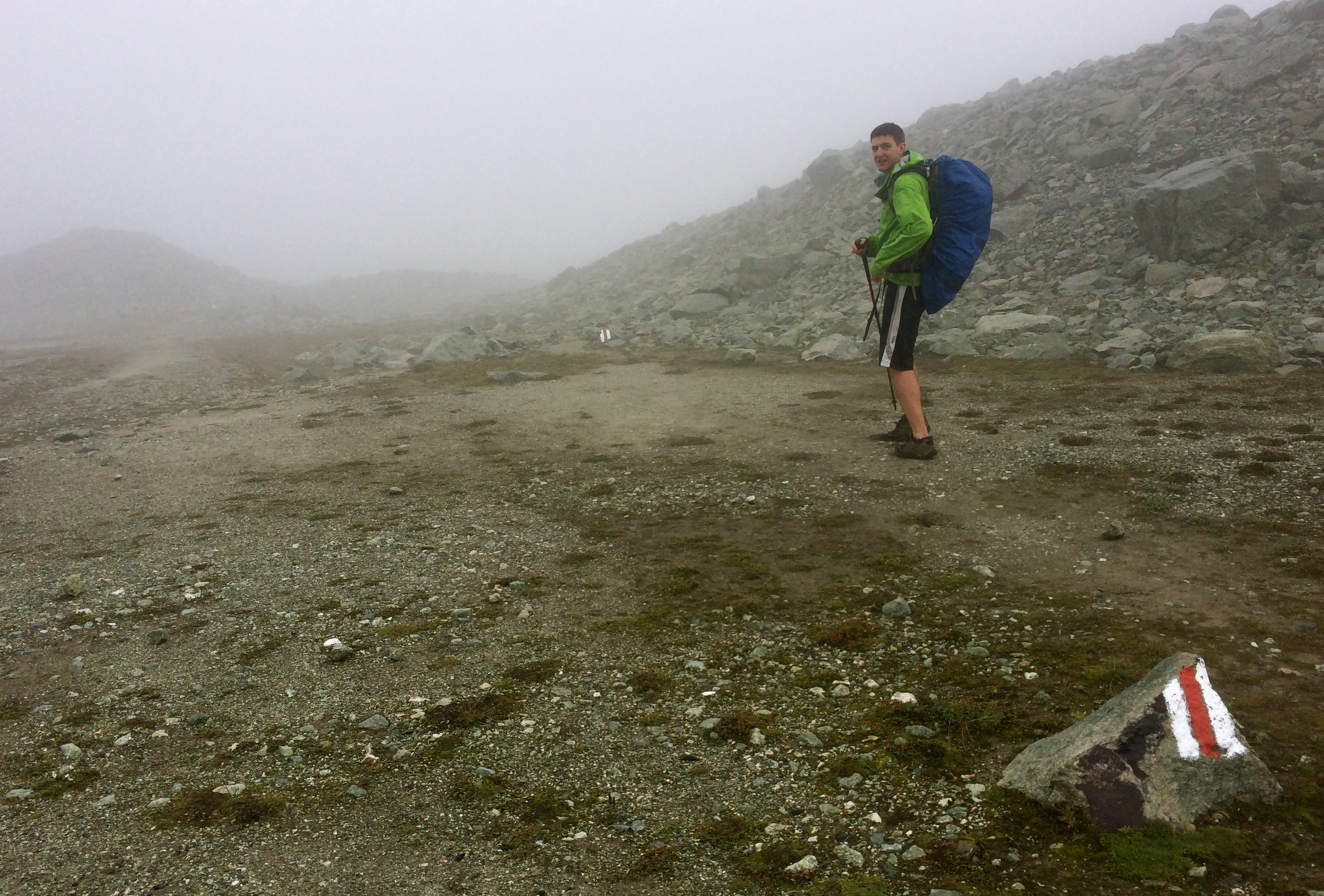 We kept moving toward the Lac des Dix, with the cold rain driving us quickly along the rocky though relatively level trail. For two hours, painted blazes and cairns were thankfully plentiful in the mist, and hefty bridges carried us across several engorged rivers cutting beautifully through red and white rock before we crested the ridge at the head of the Lac.