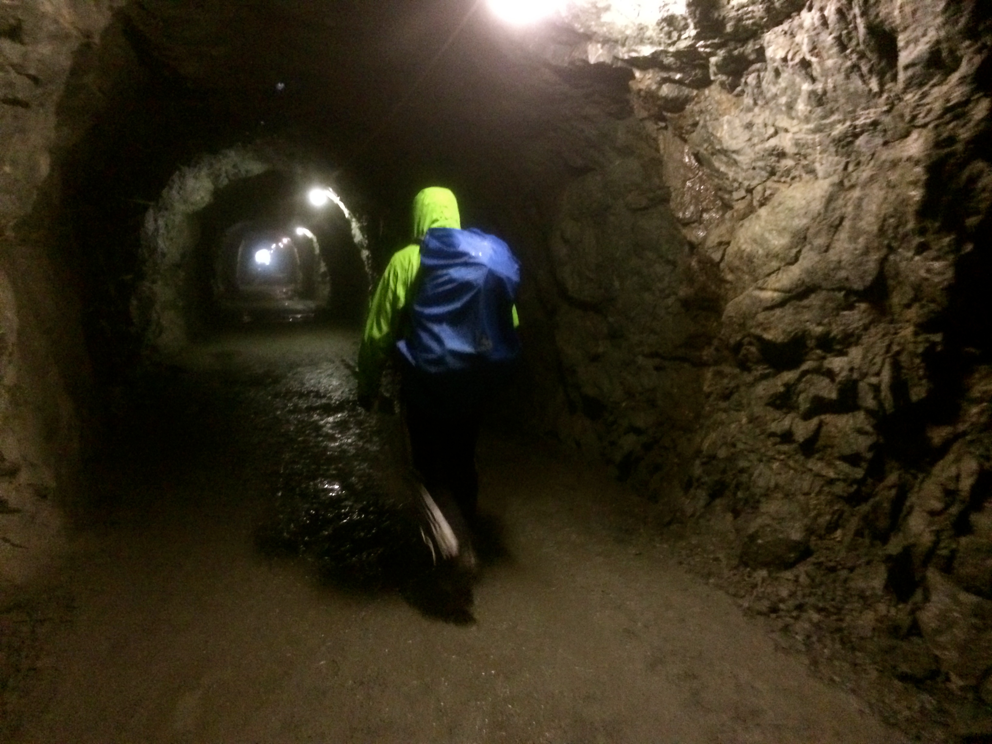 Cement ledges and even piped tunnels guided us through maybe a quarter mile of foggy rocky terrain. Even beyond the structured protection we would stop and listen to the sounds of rocks tumbling down the hill sides around us in the mist. We made haste past sections of trail that had clearly been recently damaged by smashed boulders, and found solace in hiking once more into thick trees.