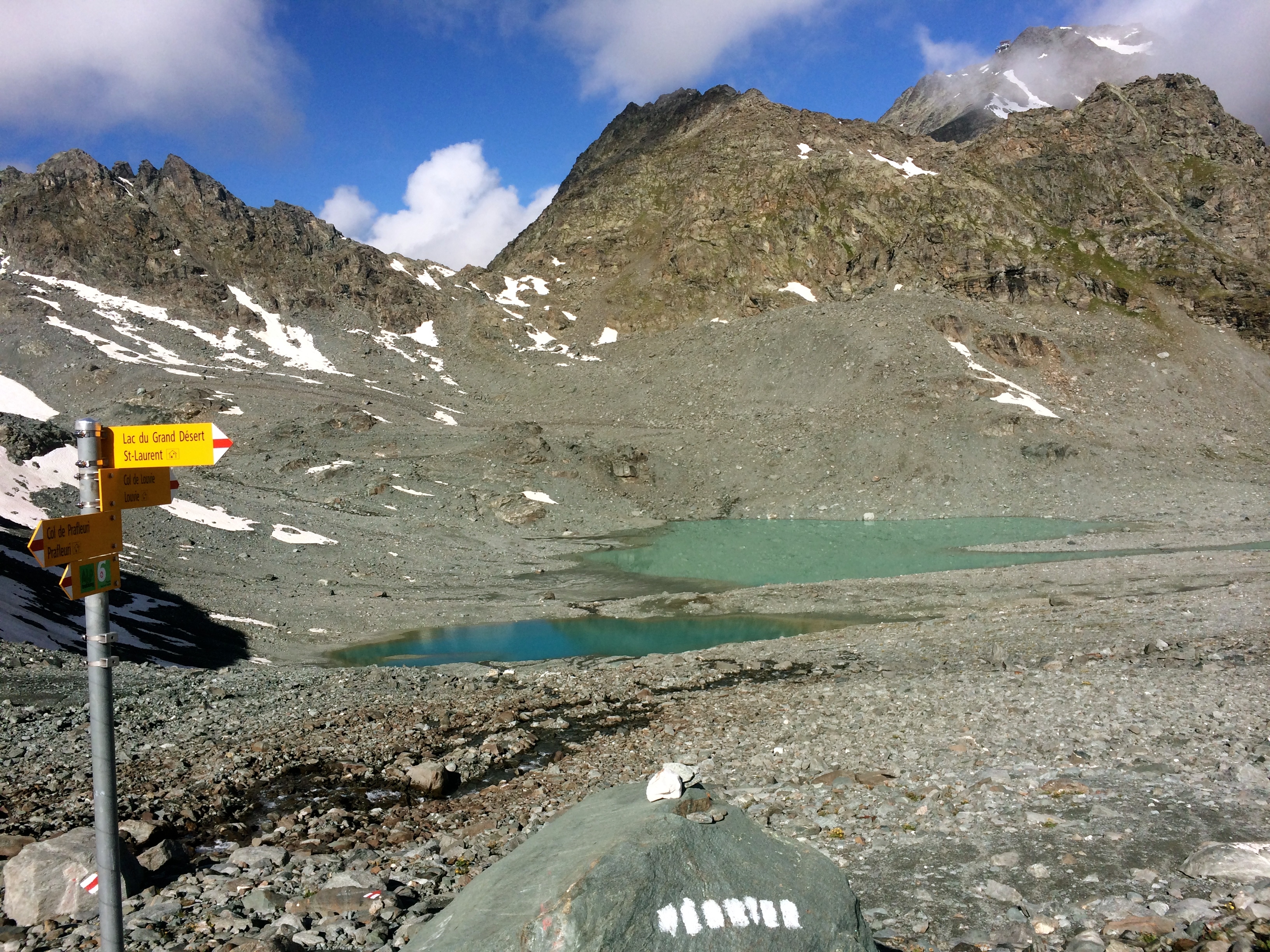 This is the start of a day above 2000m with three passes ahead of us, nothing but rocks and snow and turquoise ponds along the way. Again there were more blazes and cairns than you could shake a stick at, so even with the vary minimal route planning and simplicity of our guide book map, we had no problem figuring out the trail while in deep distracting conversation. Also, following the yellow signs provided remarkably accurate time estimates and we did many sections of the trail in pretty clean 1-1.5hr chunks.