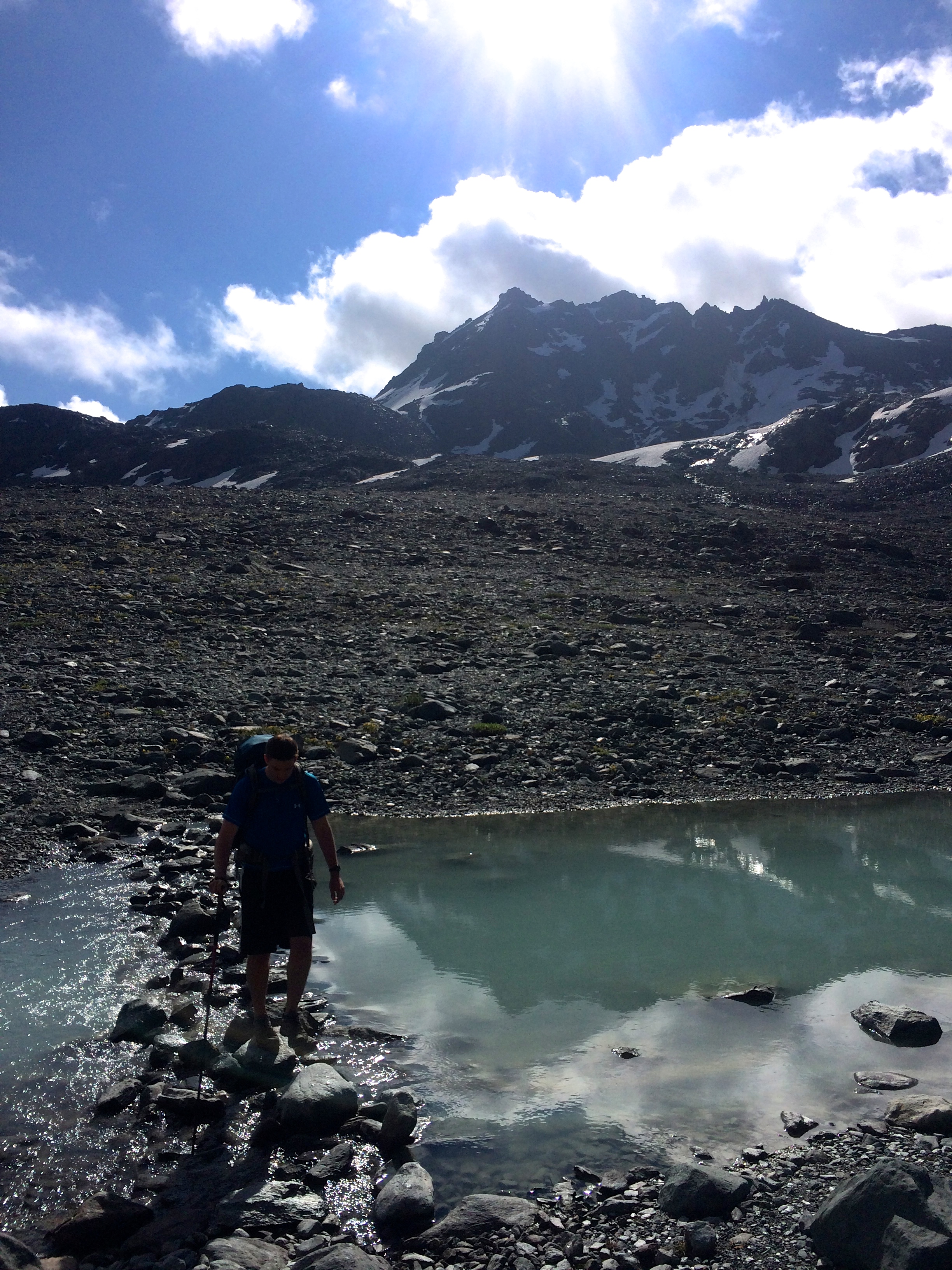 With the father-son duo on our tail, we kicked it into a comfortable high gear up the beautiful valley full of rocks, creeks, flowers and a view to die for. The trail was a well defined single track that meandered through green tundra, over and around clean white boulders as we gained elevation into the valley. The ascent was steady and steep and we found ourselves reaping the benefits of our back to back days of hiking with heavy packs.