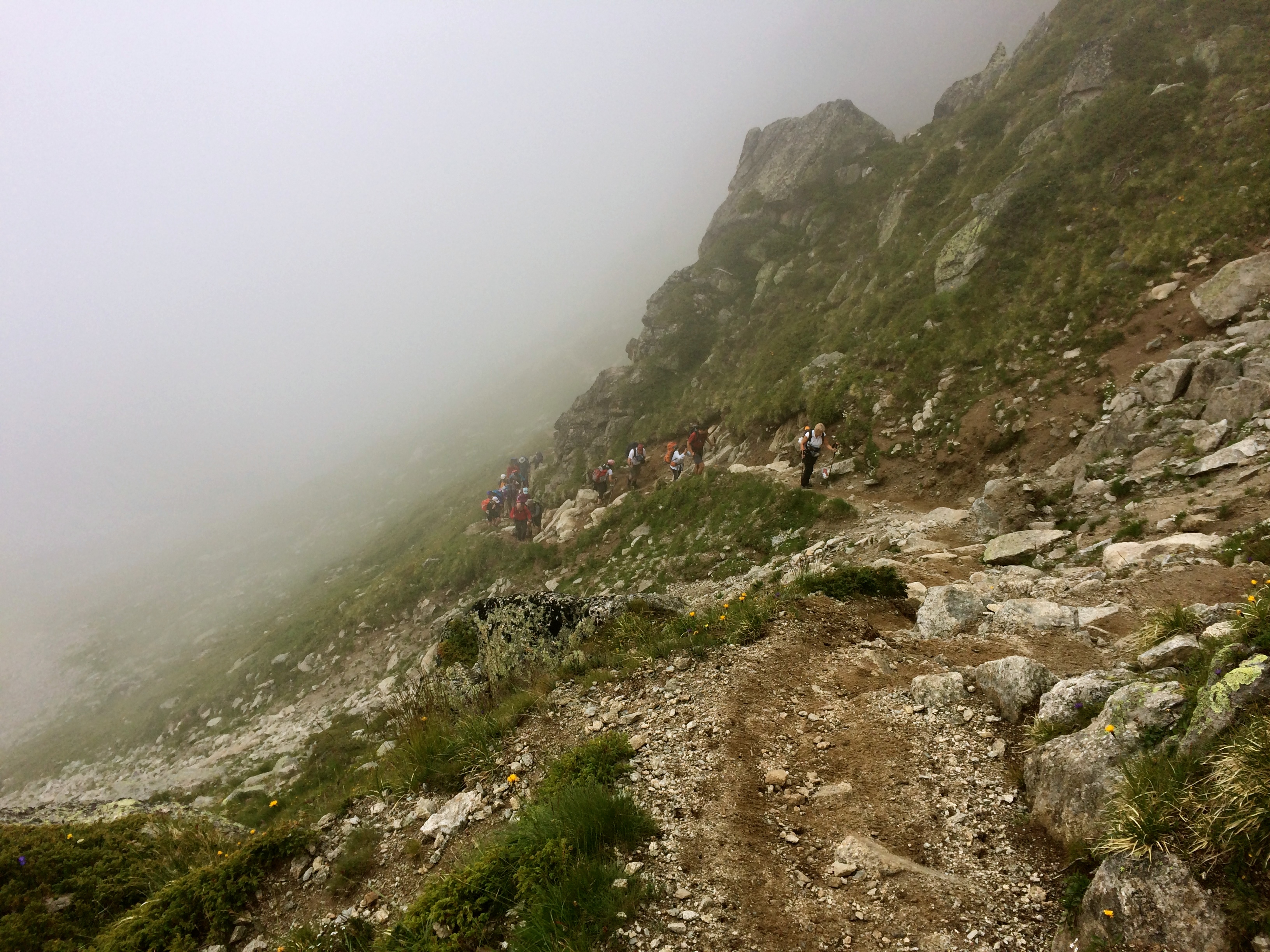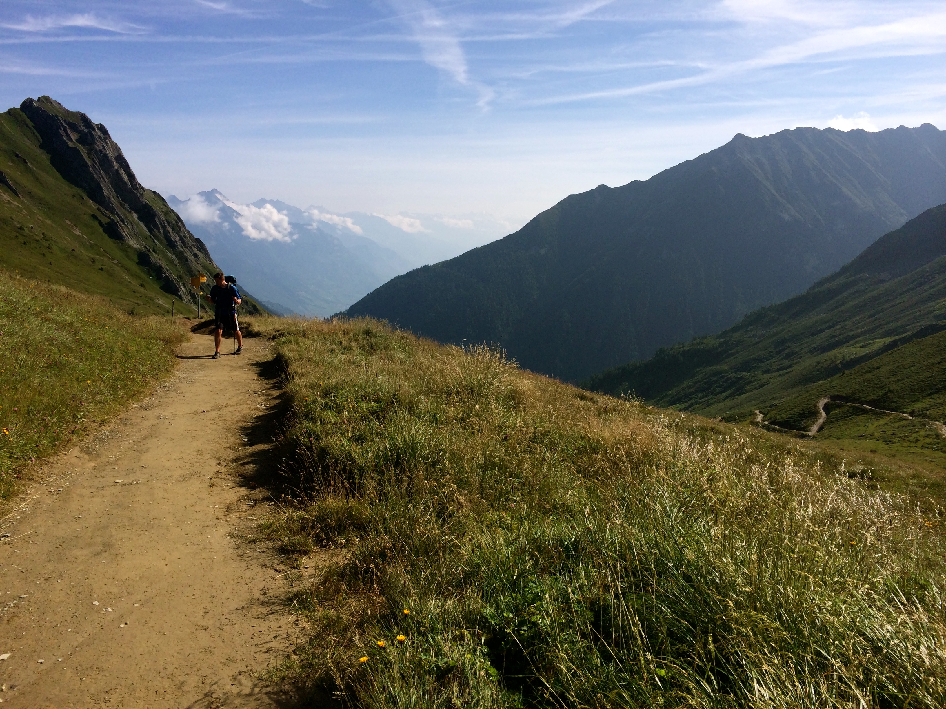 Clouds slowly engulfed us, and as the crowd grew at the summit, we got a head start on our descent before the masses started kicking rocks down on us. The descent is steep and rocky and we were glad for the stability of a trekking pole each. We frequently had to step to the side to allow passage of tour groups making their way up from Trent. The trail is shared with the Tour du Mont Blanc and the traffic increase was very apparent as we made our way into the valley. Eventually, the sun came out and bathed us as we continued the long and beautiful route to Trent, only tampered by our exhausted legs.