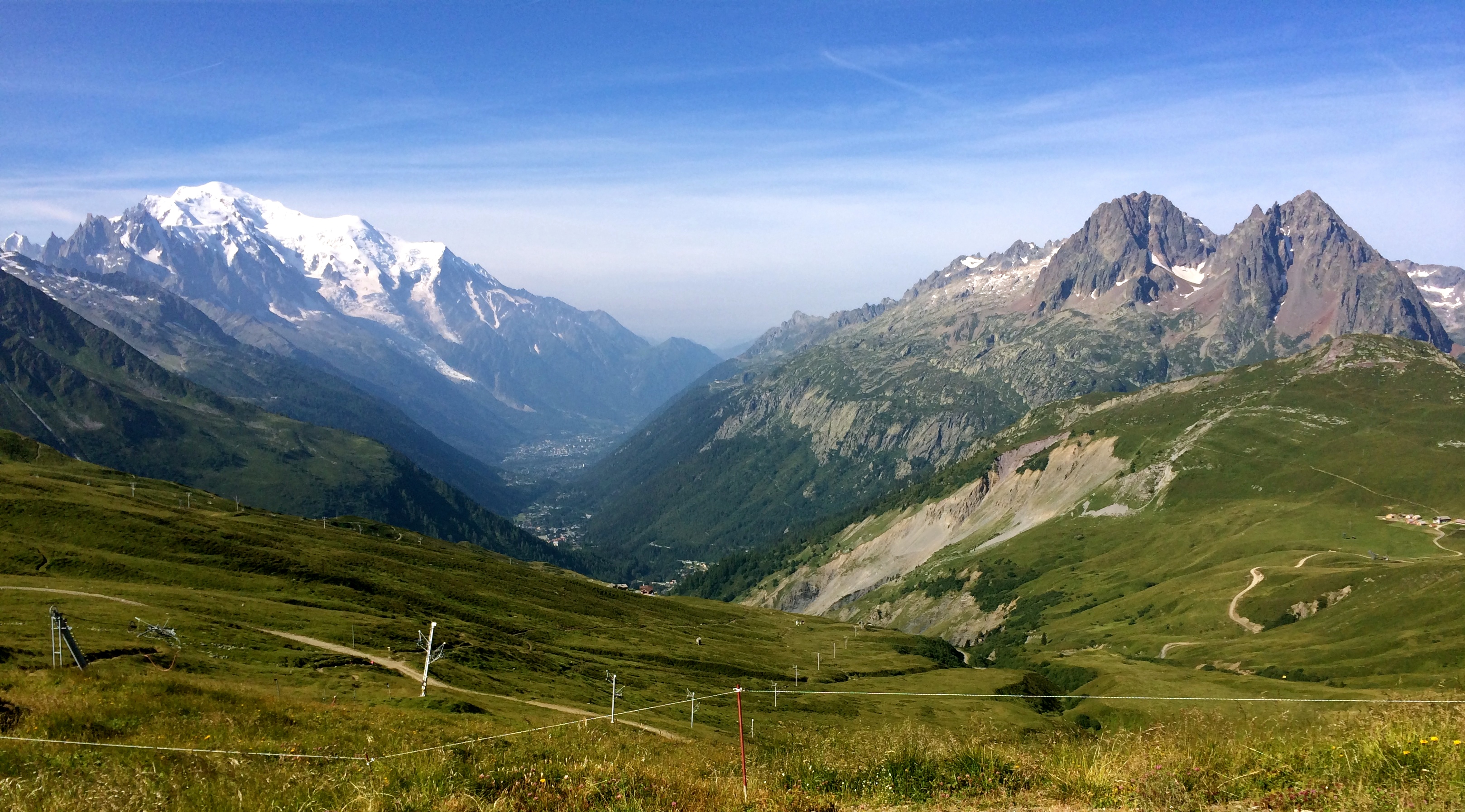The French valley before us is framed by the great snowy Mount Blanc Massif and the jagged cliffs of the Aiguilles Roughes–a stunning view. We spent a great part of the morning taking it all in before our final descent into Argentiere for an early pizza and beer dinner.