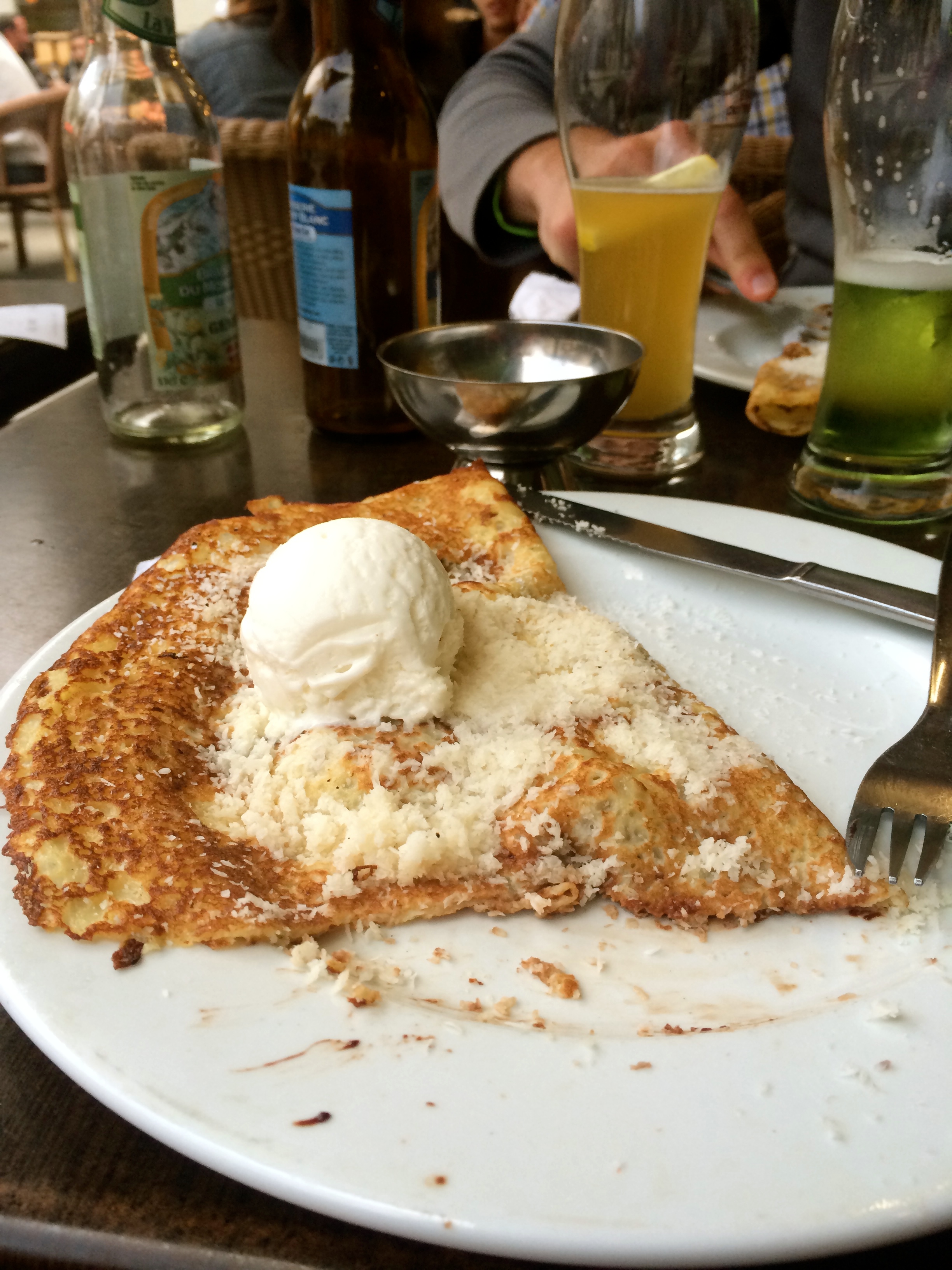 After showers and more resting/reading, we walked around the bustling streets and shops of Chamonix in the evening. We chose a main street cafe/pub to enjoy some funky French “beers” and one hell of a rum crepe. Chamonix felt a lot like Colorado’s Breckenridge, Aspen, and Boulder all smooched together at the foot of Mont Blanc. All throughout Chamonix, outdoor and adventure culture is inextricably paired with the shameless commodification of mountain environments and activities. The streets are lined with boutiques filled with high end equipment and fashion, the mountain sides are striped with gondolas and ski slopes, and the air is sprinkled with sky divers and paragliders wafting down from above.