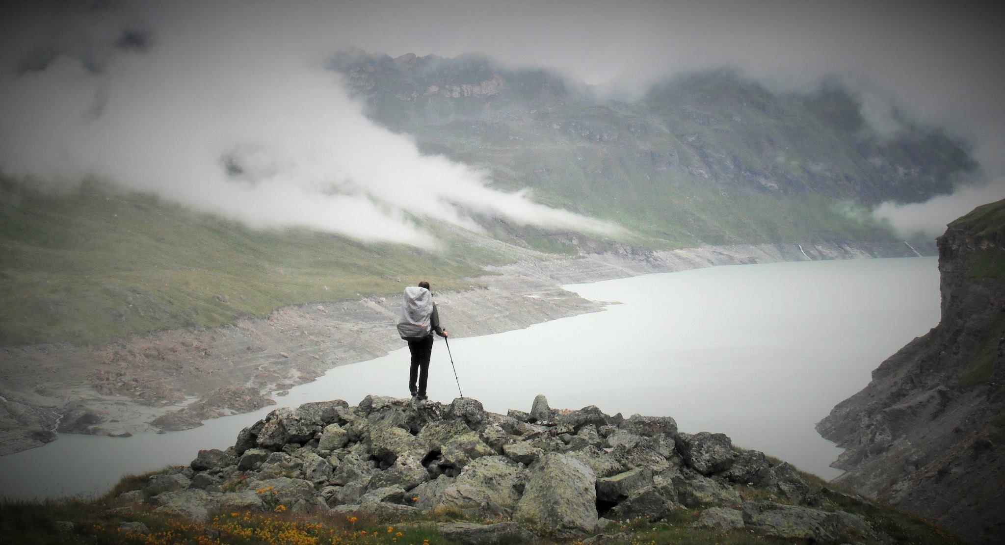 It is easy walking from here with a stunning view of the impressive reservoir even in clouds. For about 5km, the hiking is flat and level and prime for a stiff pace. Assuming we’d see obvious signs for the Refuge la Barma and the Col des Roux, we hike on autopilot letting our legs and conversation move freely. Not sure if it was the conversation or the cold rain, but we found ourselves trekking much longer on the flat track than expected, missing our expected turnoff.